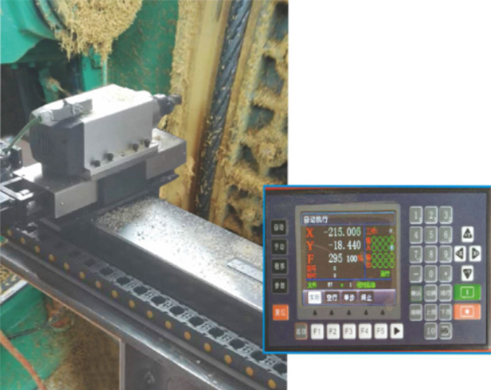 矿山竖井摩擦提升绞车厚擦衬垫是生产及安全的重要元件,摩擦衬垫的绳槽圆整度、各绳槽的底径一致性、绳槽的平行性这些指标参数是保证提升系统额定载荷、各提升钢丝绳张力差、运行震动频率和安全高效提升的重要保证。目前对绳槽加工的方式主要由人工手动车削,其工艺由于操作工技术能力高低不同及手动车削工艺的原因,绳槽车削后质量参数不能达到较佳,后期运行中导致钢丝绳窜绳、震动、张力偏差、提升能力差、溜车等不安全状况的发生。“智能绳槽旋铣机”采用车铣复合加工工艺,应用PLC程序控制,实现高精度、高自动化的新标准。不但改变了矿井提升机摩擦衬垫传统的切削工艺,而且解决了天轮衬垫无法车削的问题。是针对矿井主提升机及天轮衬垫绳槽切削的一种专用机床。相比传统的车削加工,该机床具有留能进刀、铣削速度快等特点,有效地解决了老式切削设备切削绳措时存在的啃刀、震刀、切削精度低,并且车铣复合加工更容易排屑、热变形量小,几乎不会产生由于离心力导致的工件变形。通过智能系统控制实现绳槽的高精度、高效率、稳定可靠的切削加工,绳槽成型面与钢丝绳的贴合,延长了钢丝绳的磨损周期,对钢丝绳起到很好的保护作用,延长衬垫使用寿命,提高摩据驱动系统的稳定性,能够很好的满足客户的需求。该机床纯中文界面,操作简单,节约绳槽切削工作占用的检修时间,提高生产效率,减轻工人的劳动强度,杜绝工人近距离操作的危险性,是矿井提升机绳槽维护的利器。“智能绳槽旋铣机”的应用,是减少劳动力、提高设备使用效率、节约成本,实现自动化维护的新型装备。